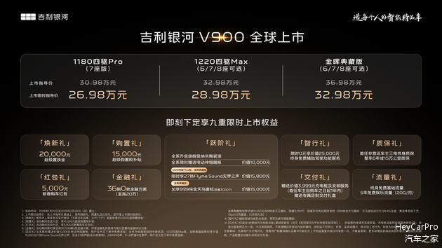 1月20日,吉利 银河V900正式上市,定位“AI全场景家庭旗舰MPV”,3个车型指导价26.98 -32.98万元。银河V900拥有非常高的91.8%得房率,车内有效长度达到3.97米。超1000mm的二、三排纵向空间,二排中央通道200mm,孩子可以在车内自由站立、穿行。后备箱空间1100L,可容纳15个20寸行李箱。配备11层云感SPA座椅,Nappa真皮、一二排通风、加热、按摩,三排通风、加热,可电动调节靠背;27扬声器Flyme Sound无界之声系统配合后排娱乐巨幕,打造沉浸式移动影音厅;-6℃~50℃超宽温域冷暖箱;采用双层夹胶静音玻璃、主动降噪和静音轮胎,静谧、环保。