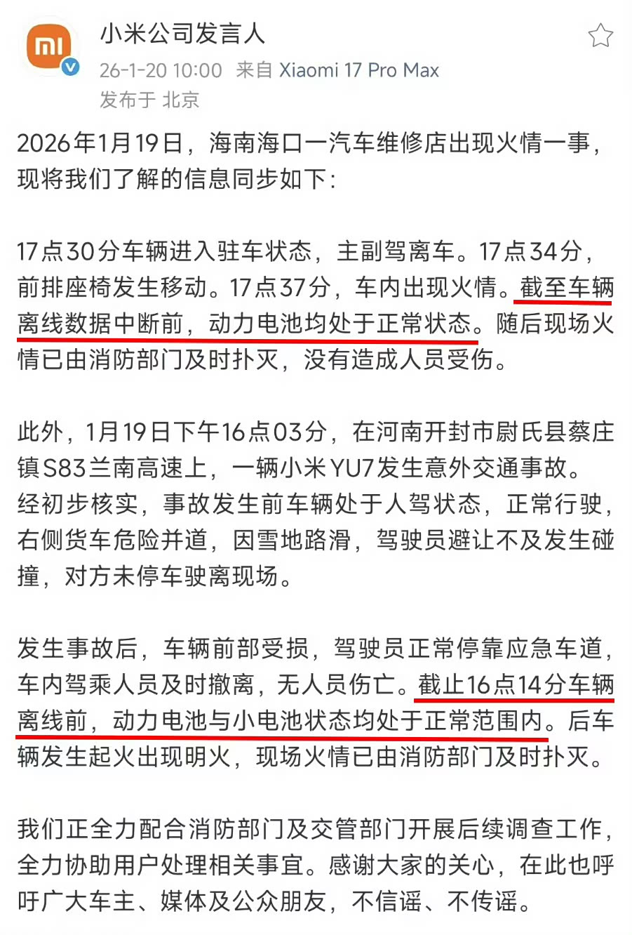 小米回应了,但是又没解释清楚,17:30人都里开车了,17:34前排座椅是怎么移动的?!就算是车主回来移动了座椅,这和17:37的时候车内出现火情有什么联系吗?!难道着火是因为移动前排座椅导致的吗?!新能源主机厂特别忌讳承认电池着火,即使大家都知道新能源车电池没有燃油车安全,但还没见过哪个厂家承认过自燃是自己产品自燃了,一定要找一个外界的因素来平衡责任,应该有个第三方调查机构来调查,持续关注这个结果……