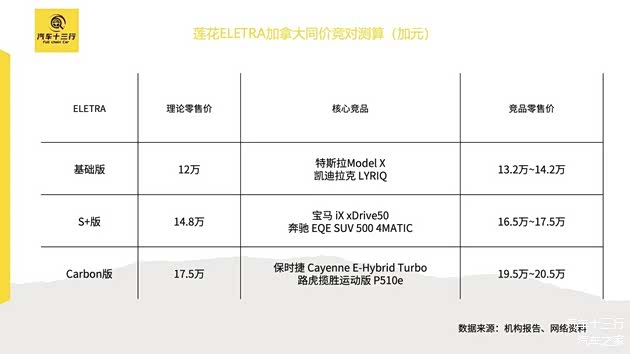 莲花ELETRA各版本理论价与同级豪华纯电 SUV 价格带高度重合,填补13-20万加元区间纯电市场空白。更为直观的是,莲花区别于传统豪华以轻量化和极致驾控为核心卖点,对标保时捷、路虎等高性能版本,同时价格低于同性能燃油混动车型约10-15%。