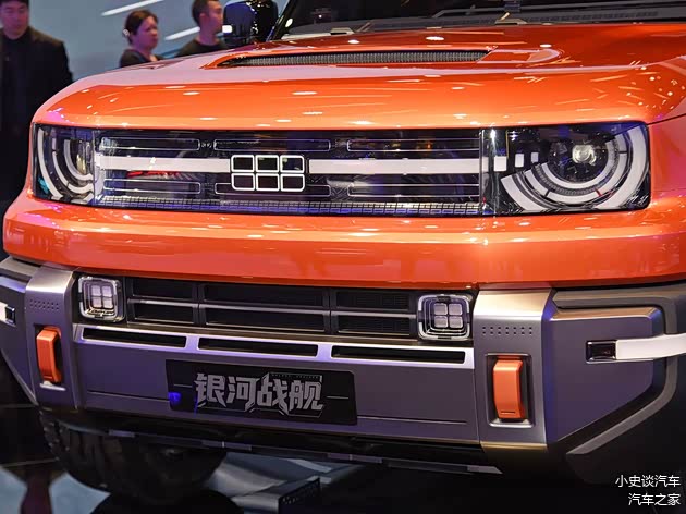 我们首先来看新车的外观设计方面,银河战舰的前脸设计堪称东西方设计哲学的完美融合。圆形"天仪之眼"大灯灵感源自古代浑天仪,配以贯穿式LED灯带,营造出复古未来主义风格。可发光LOGO在夜间极具辨识度,保险杠下方四点式光源增强了功能性。这种设计既保留了传统越野车的硬朗气质,又通过科技元素提升了现代感。前脸采用方正刚毅的轮廓,与路虎卫士等经典车型形成视觉呼应,同时通过细节处理展现出独特的东方审美。
