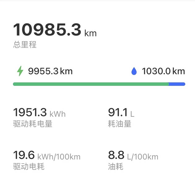 小编有一辆 理想L8,去年全年行驶了10985公里,其中纯电行驶了9955公里,烧油行驶了1030公里,APP显示驱动耗电量为1951.3度,燃油消耗了91L。因为小编和很多小伙伴一样,由于工作关系,大量的行驶里程都是城区通勤或者周边的小长途,超过500公里的长途都很少,所以能够明显看到,纯电行驶的占比非常高。