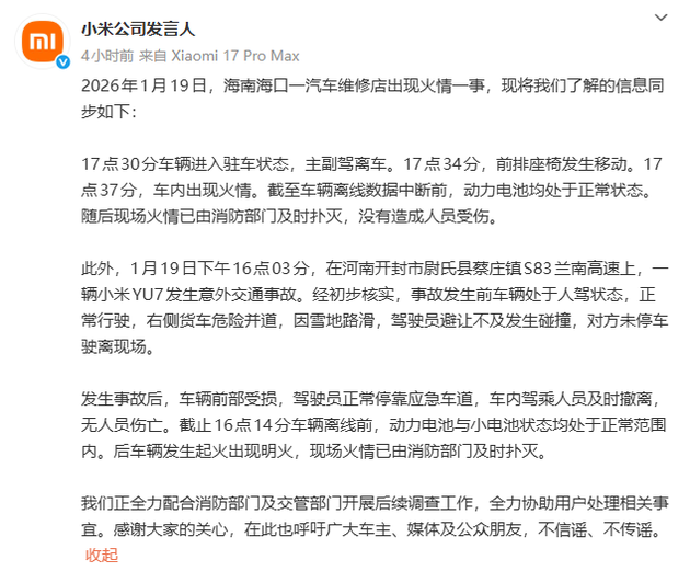 1月20日,小米公司发言人发布声明,就1月19日发生的两起车辆起火相关事件作出回应,并详细披露了事件经过及初步核查情况。第一起发生在海南海口一汽车维修店,17点30分车辆进入驻车状态,17点34分前排座椅发生移动,17点37分车内出现火情。截止车辆离线数据中断前,动力电池均处于正常状态。现场火情已由消防部门及时扑灭,没有造成人员受伤。
