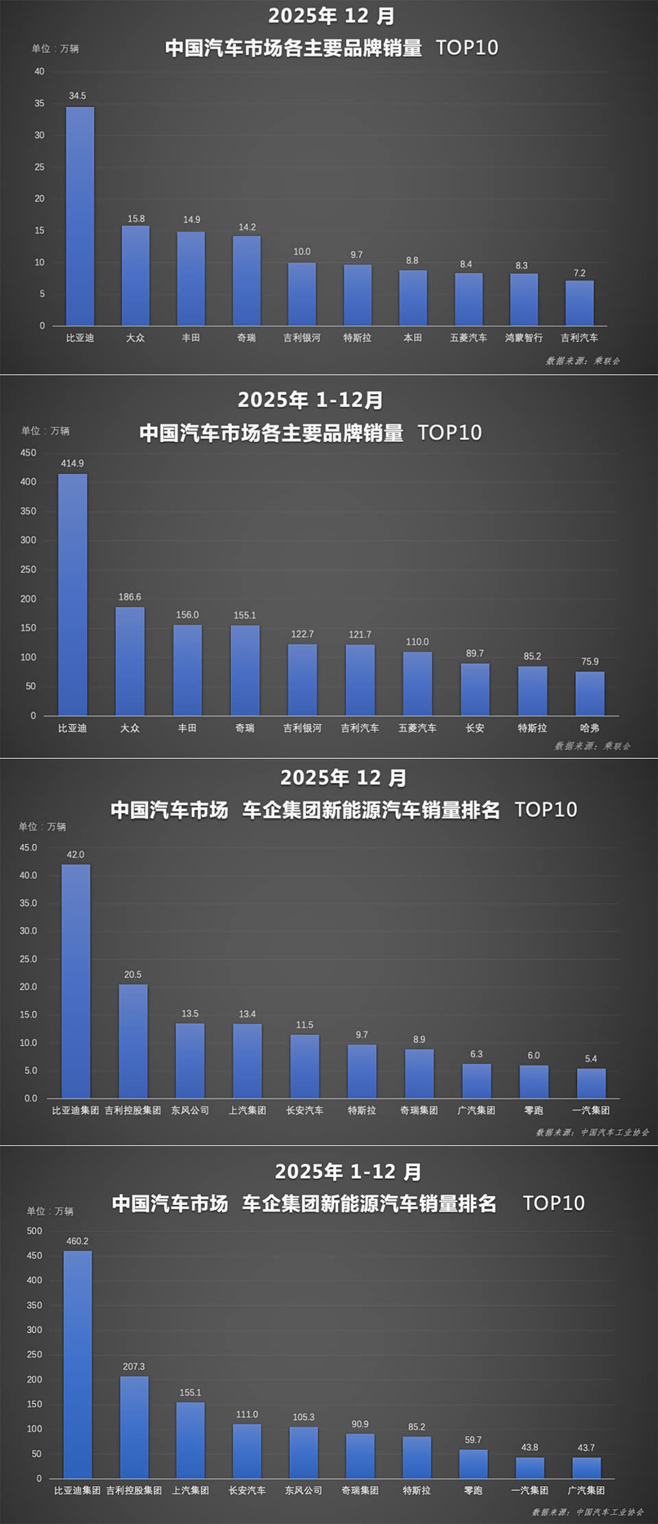 2025年中国车市年度榜单一出炉,比亚迪的表现着实亮眼!全年卖出460.24万辆,再破销量纪录,拿下国内品牌、集团、新能源销量多项第一,更实现「比亚迪全球四连冠」,稳稳坐住全球新能源龙头宝座。