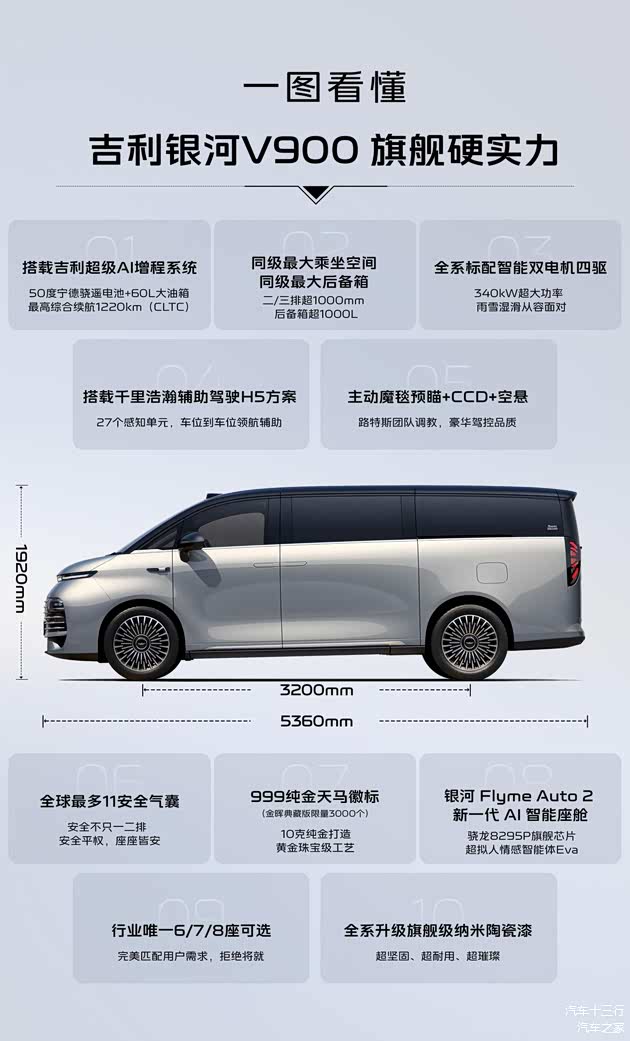 1月20日,定位为“AI全场景家庭旗舰MPV”的吉利 银河V900正式上市,共推出3个车型,上市限时指导价26.98万元-32.98万元。与以往任何大场面式发布会不同,吉利银河V900联合腾讯视频热门IP《一饭封神》殿堂主厨进行共创,将家宴做菜与造车进行有机融合,综艺效果满满。为了让更多家庭消费者深度理解吉利银河V900的上市,汽车十三行以十问十答的形式,来阐述这款吉利银河V900。