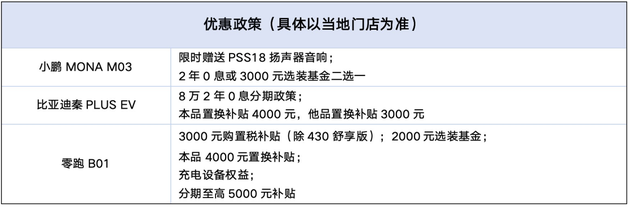 政策:MONA M03政策居中,秦PLUS EV优惠少,B01诚意足