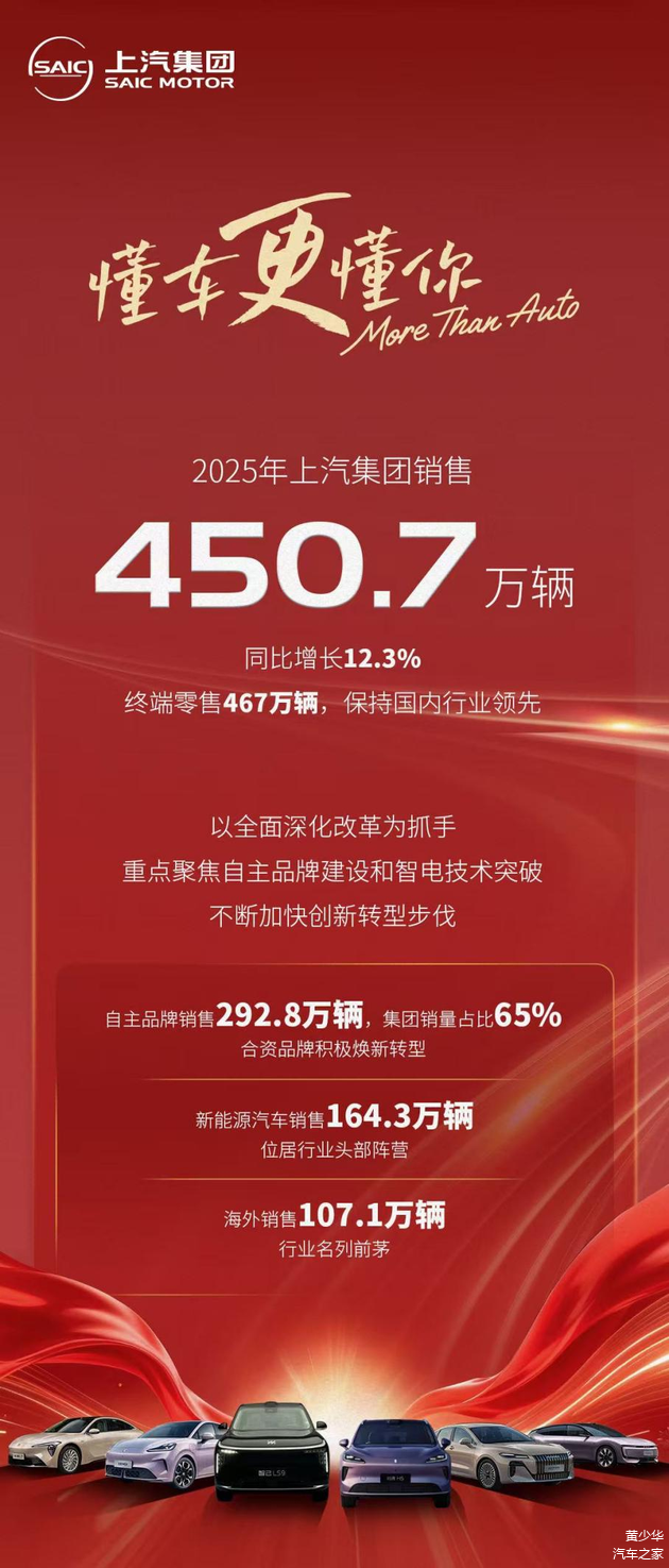 这一年,上汽不仅稳住了基盘,更完成了一次漂亮的结构性转身。数据显示,2025年全年月,上汽集团销售整车全年销售整车450.7万辆,同比增长12.3%,终端零售销量达到467万辆,继续保持国内行业领先。