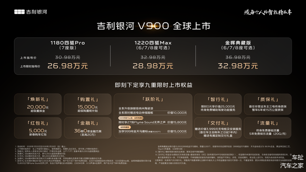 1月20日晚,吉利银河旗下V系列首款车型— 银河V900正式上市。新车共推出3款配置车型,上市限时指导价位26.98-32.98万元。新车定位“AI全场景家庭旗舰MPV”,采用增程动力,拥有260公里的CLTC纯电续航以及1220公里的综合续航。同时,官方还为前3000名金晖典藏版提车用户准备了10克纯金的礼遇。