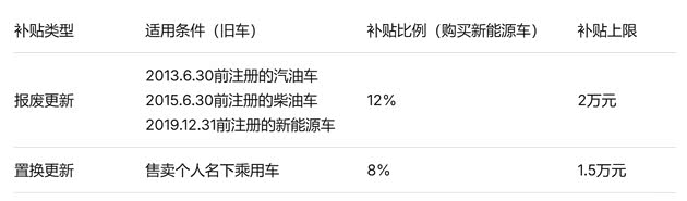 而置换更新补贴,则面向那些想换车但旧车还能继续使用的消费者。通过售卖方式转让登记在本人名下的乘用车,并购买符合条件的新能源乘用车,可获得车价8%的补贴,最高不超过1.5万元。