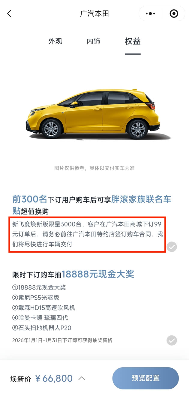 反观这次的飞度加价风波,官方规则显示「在商城下订99元后,需前往特约店签订合同」。这种看似线上化,实则仍受困于传统规则的流程,而且官方没有展示具体的剩余限量额,保留了传统购车的模糊地带,这就给了4S店利用信息差欺骗消费者、制造「晚了没车」假象的操作空间。