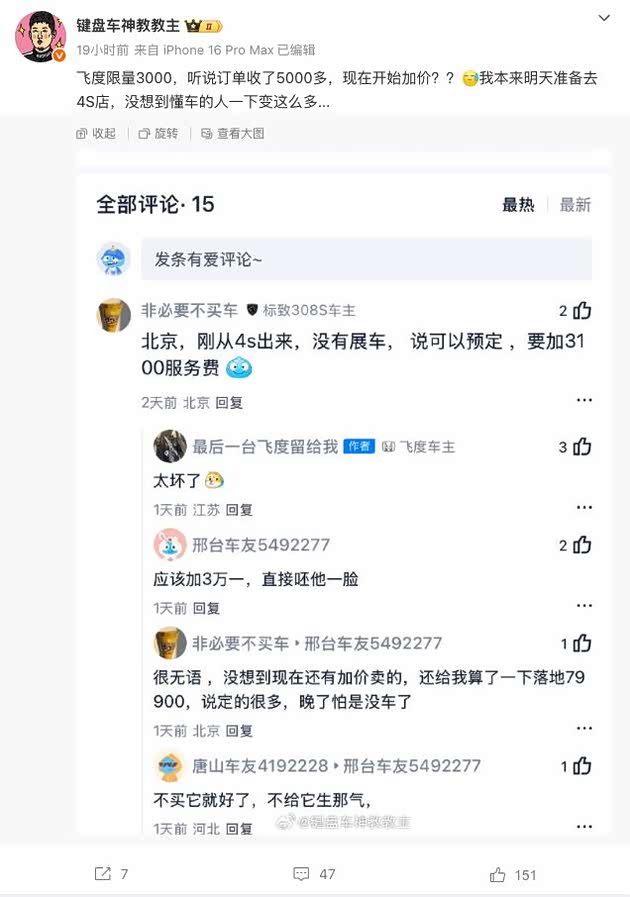 既然对方如此坦诚,电车通也不再绕弯子,直接抛出了那个敏感问题:「这车限量3000台,如果这些都卖完了,我加价的话能不能提车?」