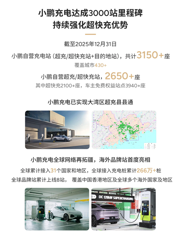 其次看补能。小鹏在国内自营超充站超过3150座,覆盖430多个城市,大湾区实现“县县通”。海外虽然没大规模自建桩,但已接入31个国家的第三方充电网络。