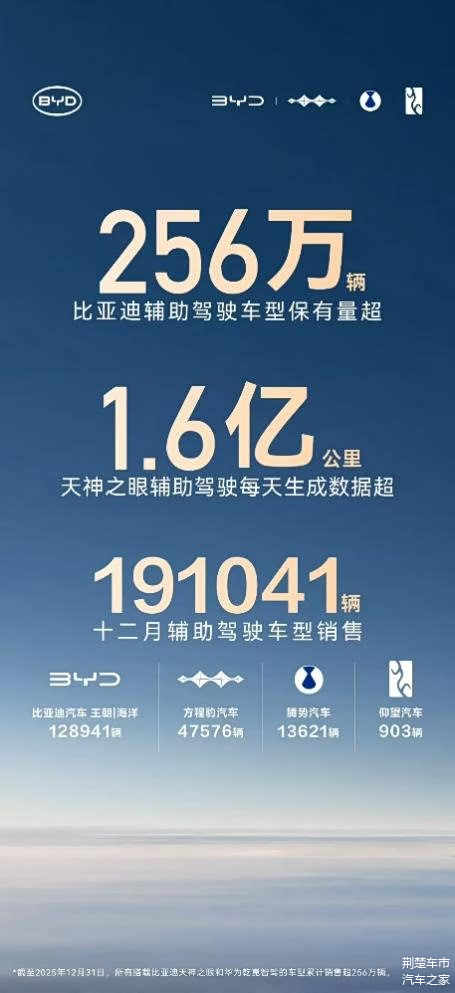 当辅助驾驶从汽车行业的 “加分项” 变成用户购车的 “必选项”,比亚迪用实力给出了最优解。截至 2025 年 12 月,比亚迪辅助驾驶车型累计保有量超 256 万辆,稳居中国车企第一,让 “全民智驾” 的承诺照进现实。