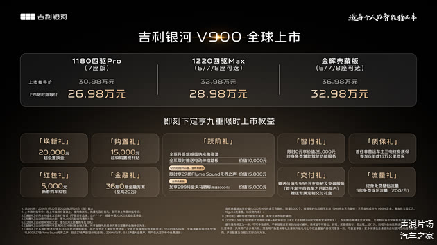2026年1月20日,吉利银河V900以一场与腾讯视频《一饭封神》IP共创的“家宴式”发布会,正式推出“AI全场景家庭旗舰MPV”。三个配置版本限时指导价26.98万-32.98万元,并同步公布九重购车权益。然而,比价格更具突破性的是,银河V900试图通过技术实现一场“车内平权革命”——让每位家庭成员获得同等尊重,而非传统MPV中常见的“二排至尊,三排将就”。
