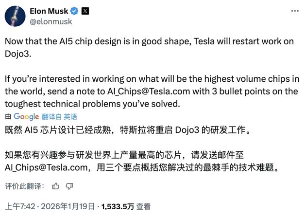 “解决AI5芯片问题对特斯拉来说至关重要。”马斯克解释道:“如今AI5进展顺利,我们终于有了一些余力,可以重新启动Dojo 3的研发工作了。”