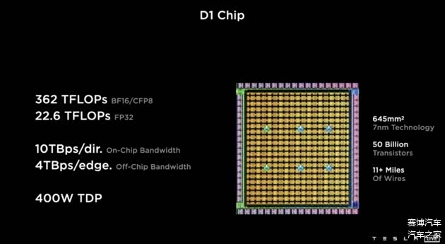 2021年特斯拉AI Day上,首款用于打造Dojo的芯片D1亮相,采用分布式结构和7纳米工艺,搭载500亿个晶体管、354个训练节点,仅内部的电路就长达17.7公里,实现了超强算力和超高带宽。