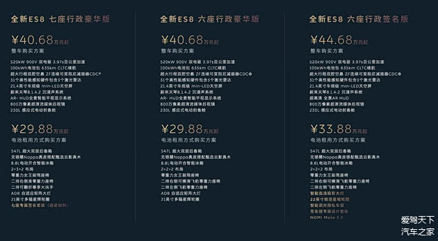 第三代ES8最大的不同,就是入门门槛大幅下调,如果选择电池租用方案,其购买售价低至29.88万元起。