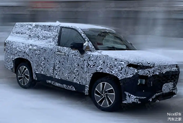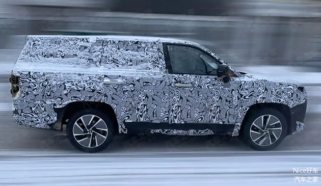 新车采用大嘴造型,C柱到D柱之间有非常长的距离,这个结构和路虎揽胜有很高的相似度。保持了传统门把手设计,未见车顶前方有激光雷达。