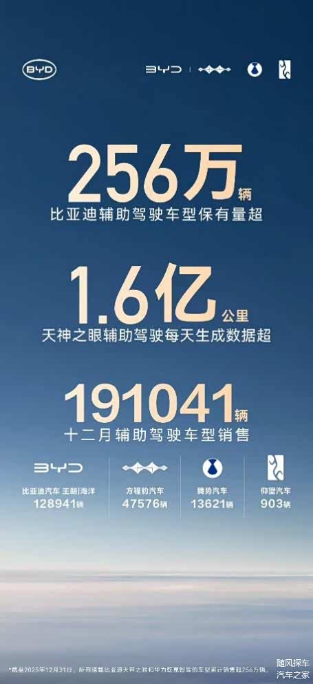 当辅助驾驶从汽车行业的“加分项” 变成用户购车的 “必选项”,比亚迪用实力给出了最优解。截至 2025 年 12 月,比亚迪辅助驾驶车型累计保有量超 256 万辆,稳居中国车企第一,让 “全民智驾” 的承诺照进现实,让技术普惠走入千家万户。