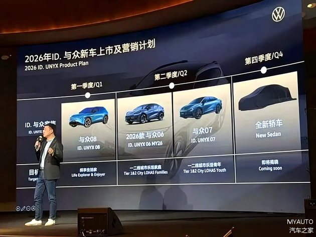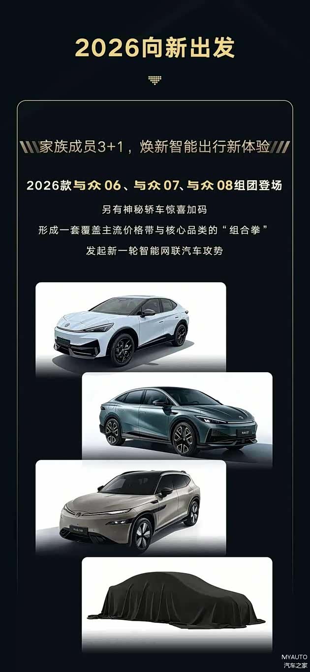2025年略显沉寂的大众安徽,将在2026年迎来爆发式的“逆袭”。根据最新规划,今年一季度,大众安徽将率先推出其首款中型智能电动SUV——与众08。紧接着在第二季度,2026款与众06和全新车型与众07也将相继上市,而第四季度还会压轴亮相一款全新轿车。一口气推出四款新车,大众安徽这“后劲”确实有点猛。