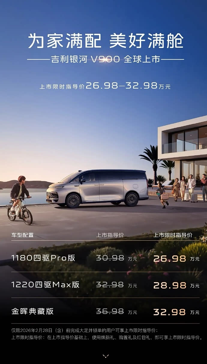 银河V900 的上市,可以说是给2026年的MPV市场一个定调!5米3级的超级大的增程MPV,26.98万起! 这样一来,反而是给后续的几个 超长纯电续航的 增程MPV不小压力了。 大电池续航就意味着价格必然高,想要保证价格有竞争力,就势必要牺牲一些体验。而银河V900又恰恰是体验感拉满的车型。 所以我觉得V900的打法是对的,既然有增程器,就不要太纠结太大的电池了。纯电续航给到400~500km,增程器成摆设了也是浪费。汽车要的还是综合的产品力。