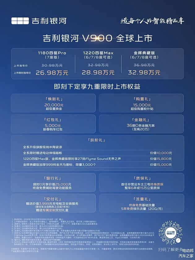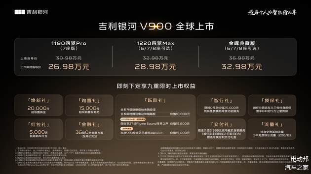 1月20日,吉利银河旗下V系列首款战略车型——吉利 银河V900正式上市,定位『AI全场景家庭旗舰MPV』,推出3款车型,上市限时指导价覆盖26.98万元-32.98万元区间。