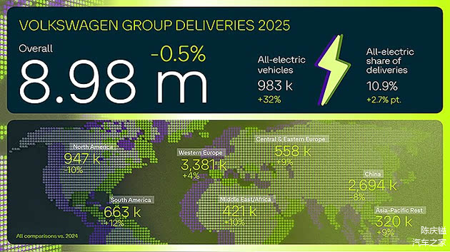至于各品牌电动车销售成绩,包含奥迪、Porsche 两个豪华品牌,以及 VWCV、斯柯达以及 Seat / Cupra 等在内,电动车销售都较 2024 年有着大幅成长,其中有着 ID.Buzz 车系的 VWCV,以及有着 Enyaq 家族与 Elroq 的斯柯达,成长幅度都超过 100%,大众乘用车则是属于持平表现,全年度电动车累计销售 382,000 辆,对比 2024 年为 0.2%的下滑。