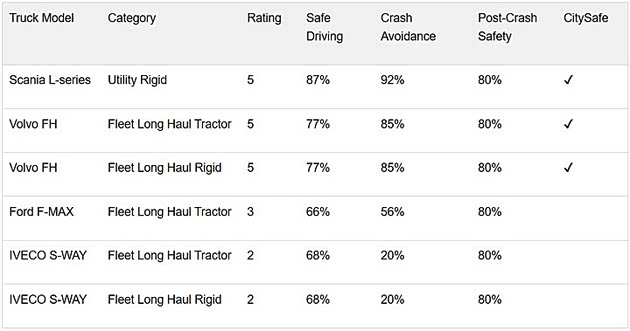 继 Euro NCAP 于 2025 年 10 月初公布多款重型卡车的评测成绩后,近日也揭晓了新一轮的测试结果,受测的车型包含了 Scania L-series、Volvo FH ( 两种车型版本 ) 、福特 F-MAX 和 Iveco S-WAY ( 两种车型版本 ) ,最终 Scania L-series 与 Volvo FH 获得了最佳的 5 星肯定,并且同步得到「CitySafe」城市安全的认证;至于 福特 F-MAX 和 Iveco S-WAY 分别被评为 3 星与 2 星,在安全配备上都还有进步的空间。