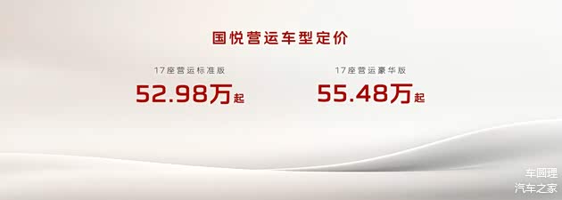 立足红旗金葵花国悦车型的成功基础与对营运市场的深度洞察,红旗倾力打造的红旗金葵花国悦营运版,是红旗对高端商务接待、旅游租赁、政企通勤等场景专业化、品质化升级需求的精准回应。新车提供17座营运标准版和17座营运豪华版两款车型,官方指导价分别为52.98万起和55.48万起,以差异化配置和丰富的个性化选装,精准满足不同运营商对高效可靠、持久盈利的核心诉求,同时为乘客创造“安全、尊享、舒适”的出行体验。