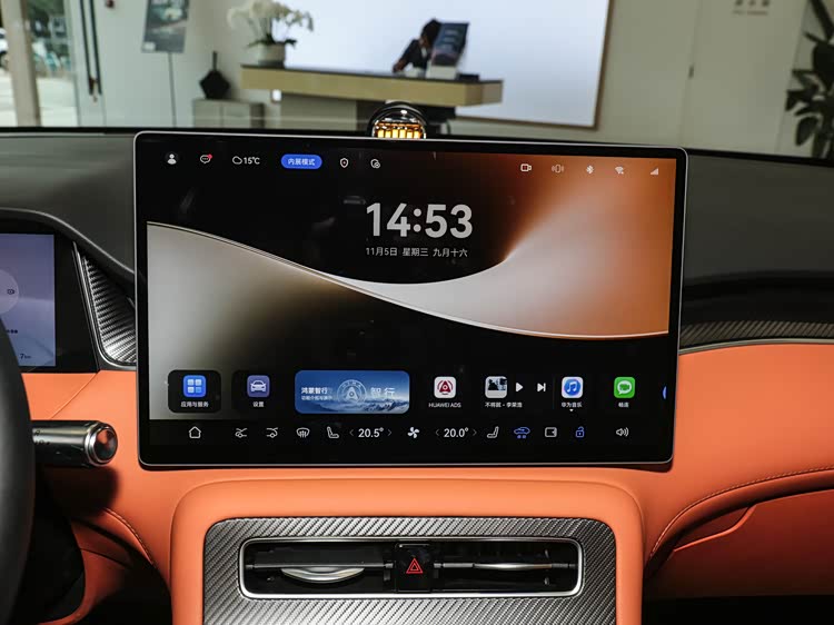 内饰设计上,两款车都走简约科技风。值得一提的是,两款车都用了电子怀挡设计,操作逻辑相近,还能节省中控台空间,让座舱更有科技感也更实用。尚界H5采用双层环抱式布局,三辐式多功能方向盘握感不错,功能分区清晰,加上鸿蒙家族标志性的星环散射体装饰,内饰看起来清爽又有质感。还提供凝夜紫、韶华杏等四款内饰颜色可选,大面积软质材料和仿麂皮拼接,摸上去很舒服。中控台上10.25英寸全液晶仪表和15.6英寸悬浮中控屏搭配协调,全系标配鸿蒙座舱,这也是它的一大亮点。依托华为生态,能实现多屏联动、手机无感连接和超级桌面功能,前排座椅后方的HUAWEI MagLink接口,用磁吸支架就能拓展后排设备,语音控制反应快,还支持场景化指令。