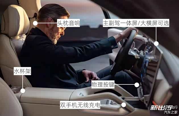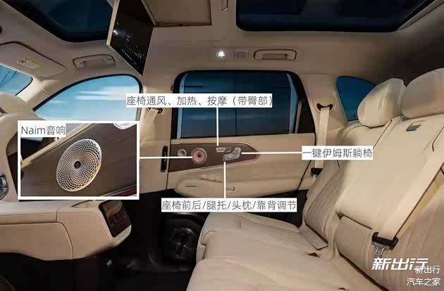 细节上还能看到该车二排同样也带有头枕音响的功能,并且支持选装 Naim 音响,某些豪华配置都传承了极氪 9X。