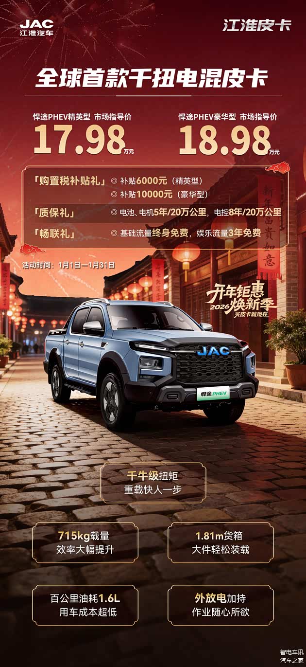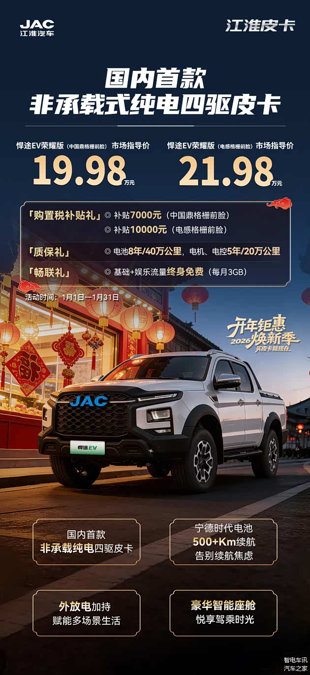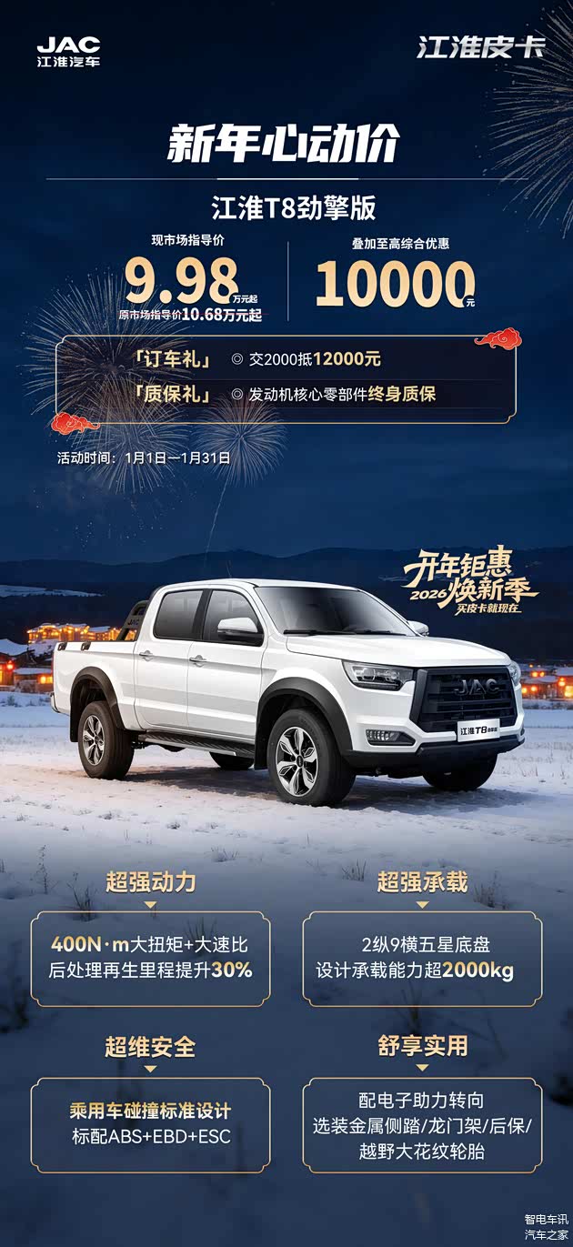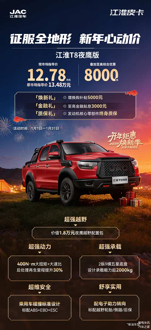 买皮卡,就现在!新年伊始,江淮皮卡“2026焕新季”火热来袭,爆款车型诚意满满,燃油、混动、纯电多重动力选择。具体情况如何,咱们细细道来!