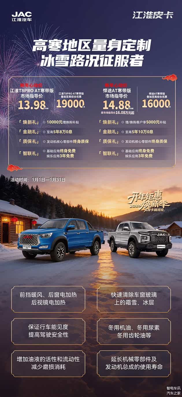 针对北方高寒地区用户,江淮皮卡推出江淮T8 PRO AT与江淮悍途AT两款“寒带版”车型,一系列专属配置有效解决了冬季启动难、视野差、磨损大等痛点。其中,江淮T8 PRO AT寒带版心动价13.98万元,再享至高19000元综合优惠;江淮悍途AT寒带版心动价14.88万元,再享至高16000元综合优惠。