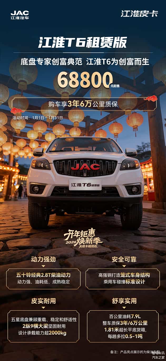 底盘专家,创富典范! 江淮T6租赁版以6.88万元的起售价和3年/6万公里的整车质保,直击初创及中小企业主的成本敏感需求。国擎(原三菱)2.4T汽油发动机,五十铃经典2.8T柴油发动机,兼顾动力与油耗;1.81米超长平底货箱与超2000kg的设计承载能力,确保了出色的装载性。