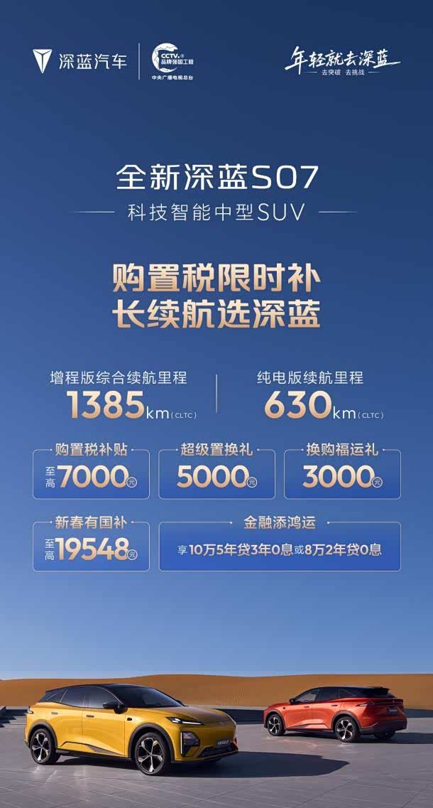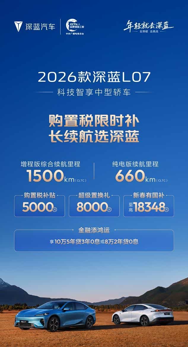 车盟快讯:新春返乡购车季,深蓝汽车启动“过年回家路途长,就选深蓝长续航”主题直播。活动聚焦S05、S07、L06、L07四款长续航车型,最高670km纯电续航+15分钟补能335km,破解续航焦虑。同步释放购置税补贴至高1万元、换购礼1万元、国补2万元及5年0息等限时福利,现车直提无需等待。作为获中国首张L3自动驾驶牌照的央企,深蓝明确L3阶段车企安全主体责任,叠加全球70万交付量背书,61.22亿融资加码技术研发,让消费者享福利与安心双重保障,这波福利你心动了吗?#过年回家路途长就选深蓝长续航#深蓝汽车