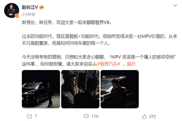 1月21日消息,就在上周,前腾势汽车总经理官宣加入智界,担任智界汽车执行董事及执行副总裁。就在今天,他公布了一组跟智界新车V9的合影,并表示,“MPV应该是一个懂人的移动空间”。