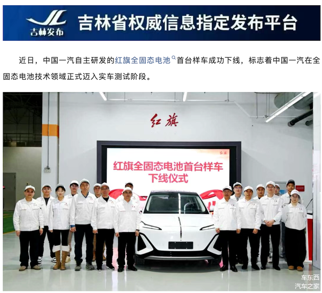 ▲红旗全固态电池首台样车成功下线