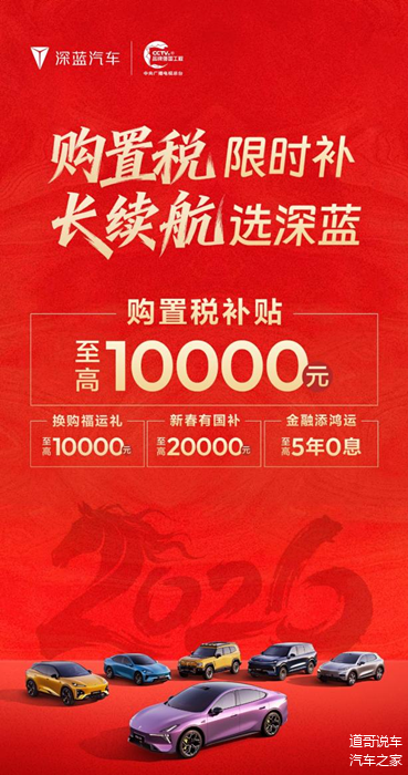 马年行好运,新春购新车。春节前夕正值购车政策红利期,选择深蓝汽车,也就意味着将同时获得“央企品质保障、长续航核心优势、全系限时补贴”三重利好。2026,和深蓝一起,即刻焕新座驾,解锁新春出行新体验!