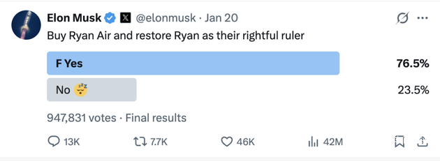 马斯克在美国当地时间1月20日作出回应,他在自己控股的X上发起收购瑞安航空的投票,期间他回骂了奥利里。截至发稿前,投票结果是76.5%赞成收购,23.5%反对。