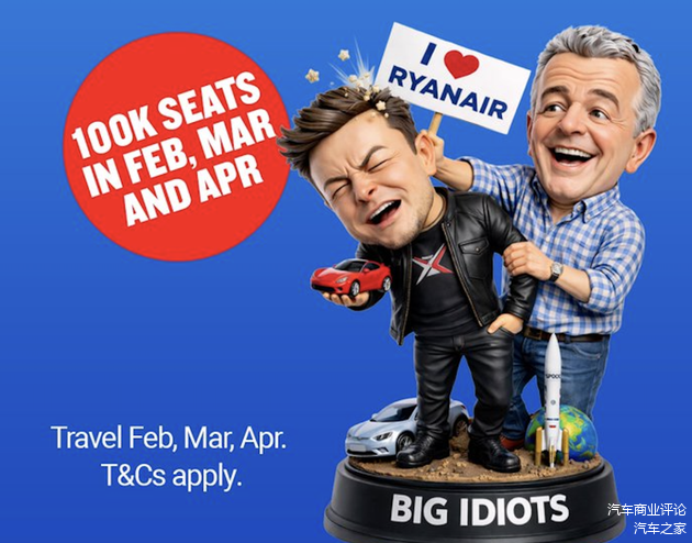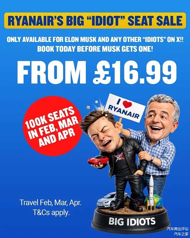 在马斯克说要收购瑞安航空开除奥利里的同一天,这家公司在X的官方账号上推出了“白痴座位”销售,16.99欧元起售,共预设10万个座位,2026年1月-4月都有售。