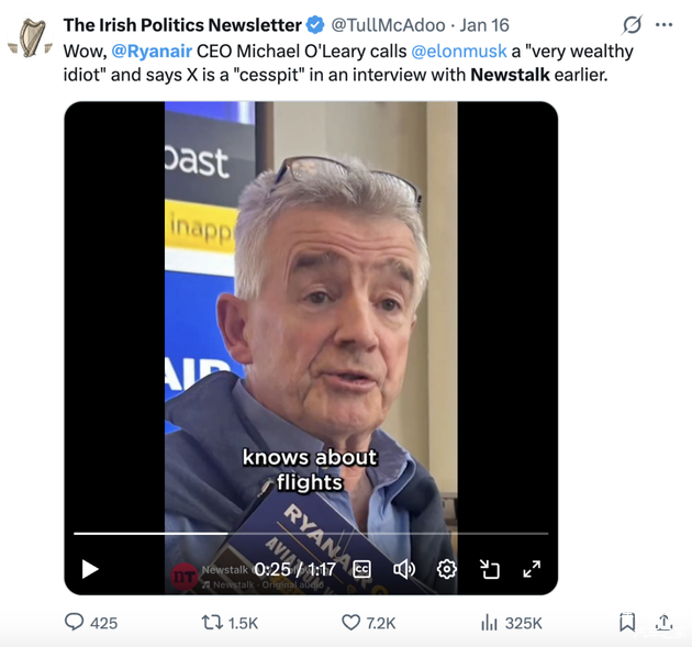 马斯克和奥利里的过节,主要是因为奥利里没有同意安装马斯克的Starlink在瑞安航班上。要命的是,奥利里在2026年1月中旬接受爱尔兰Newstalk采访时,他说马斯克是个白痴。