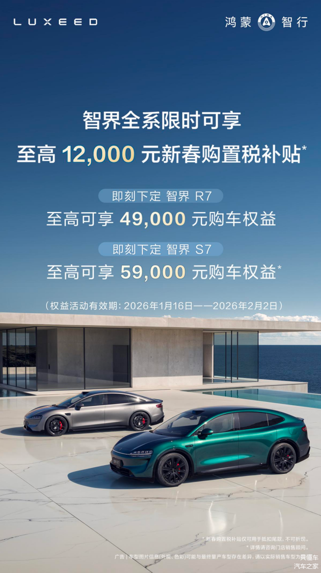近期智界推出春节限时福利,即日起至2月2日,购买智界全系车型可享至高12000元新春购置税补贴,其中智界R7权益至高49000元,智界新S7权益至高59000元,让更多用户轻松解锁高品质纯电出行。