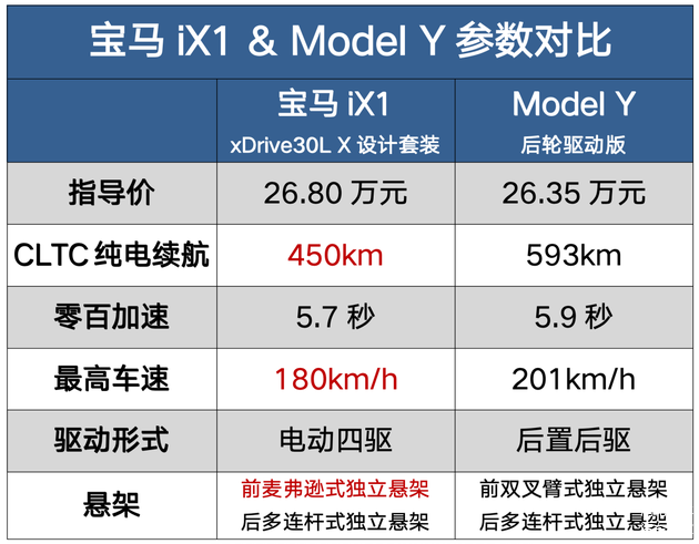 我把宝马iX1和同价位的特斯拉Model Y做了一个简单的参数对比,两者的价格非常接近,但是宝马iX1只有450km的纯电续航,且最高车速只有180km/h,前悬架也是麦弗逊式的,这些都是不如特斯拉Model Y的,当然了,宝马iX1的优势是有一套四驱系统。单纯从上面两款车的硬件参数上来看,我觉得宝马iX1是不如特斯拉Model Y的。