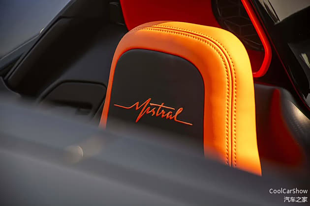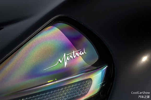 Mistral的造型更加低矮,前脸的马蹄造型进气格栅变得更大了,为了更高的下压力,全碳纤维的下扰流向前延伸更多,整个前脸的造型更具攻击性,尾部的造型也变得更加夸张。