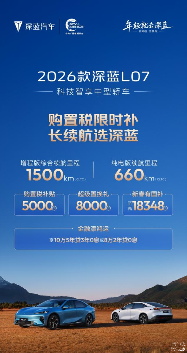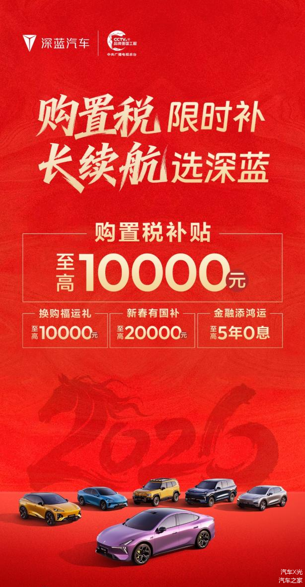马年行好运,新春购新车。春节前夕正值购车政策红利期,选择深蓝汽车,也就意味着将同时获得“央企品质保障、长续航核心优势、全系限时补贴” 三重利好。2026,和深蓝一起,即刻焕新座驾,解锁新春出行新体验!