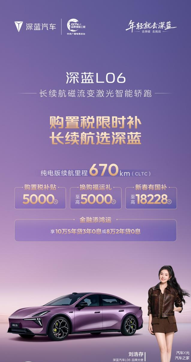 同时,深蓝L06以满满诚意推出多重购车福利,大幅降低智能座驾拥有门槛。消费者购车即享5000元购置税补贴、至高5000元换购福运礼、至高18228元新春国补,金融方案可享10万5年贷3年0息或8万2年贷0息。年轻消费者无需背负高额资金压力,就能轻松入手这款颜值与续航兼备的智能轿跑。