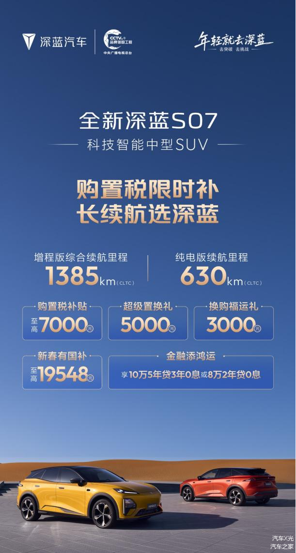 现购车可享至高7000元购置税补贴、5000元置换礼、3000元换购礼及至高19548元新春国补,另提供多种零息金融方案。深蓝S07以更高价值,满足用户对长续航与豪华出行的双重期待。