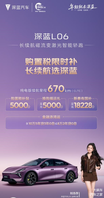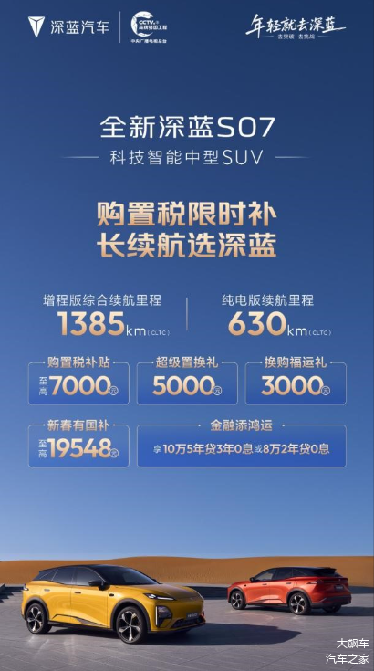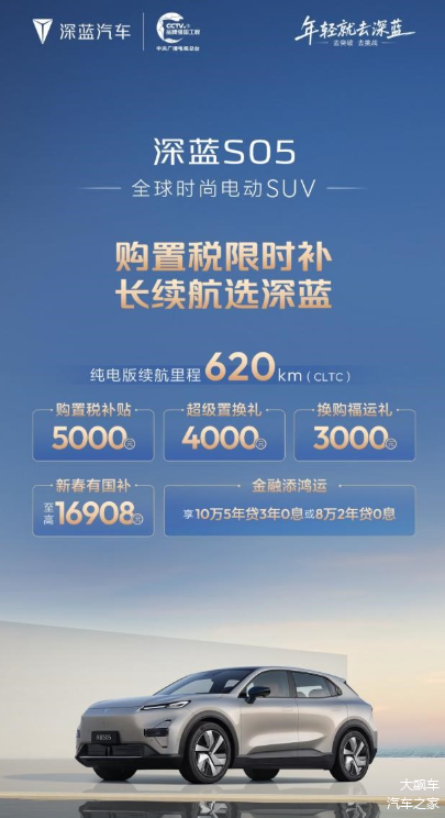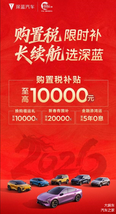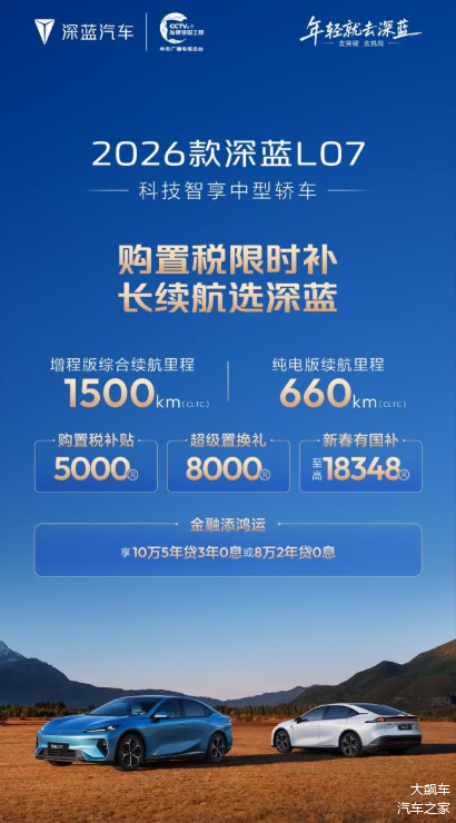 此次政策覆盖 深蓝S05、S07、L06、L07四款长续航车型。企业宣布推出购置税限时补贴,至高10000元,并可叠加换购礼、新春国补红包等现金优惠。同时提供“金融添鸿运”方案,至高可享5年0息贷款。
