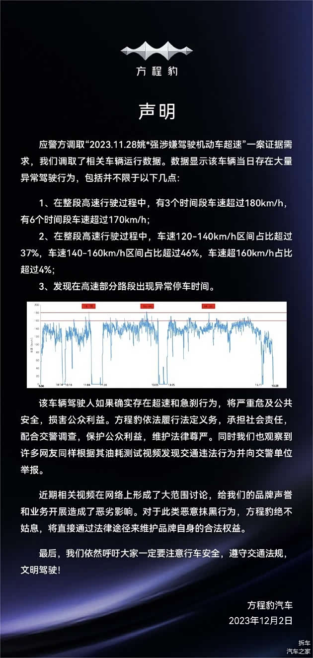 据此前公开报道,汽车博主姚*强于2023年发布视频称,自己驾驶刚上市不久的方程豹 豹5在高速上跑出了18L/100km的油耗,与官方宣传的7.8L/100km亏电油耗相差甚远。事件发酵后方程豹汽车进行了回应,指出后台数据显示车辆在行驶中有3个时间段车速超过180km/h,有6个时间段车速超过170km/h;车速120-140km/h区间占比超过37%,车速140-160km/h区间占比超过46%,车速超160km/h占比超过4%;中途还曾多次异常停车。方程豹汽车表示对于此类恶意抹黑行为绝不姑息,将直接通过法律途径来维护品牌自身的合法权益。