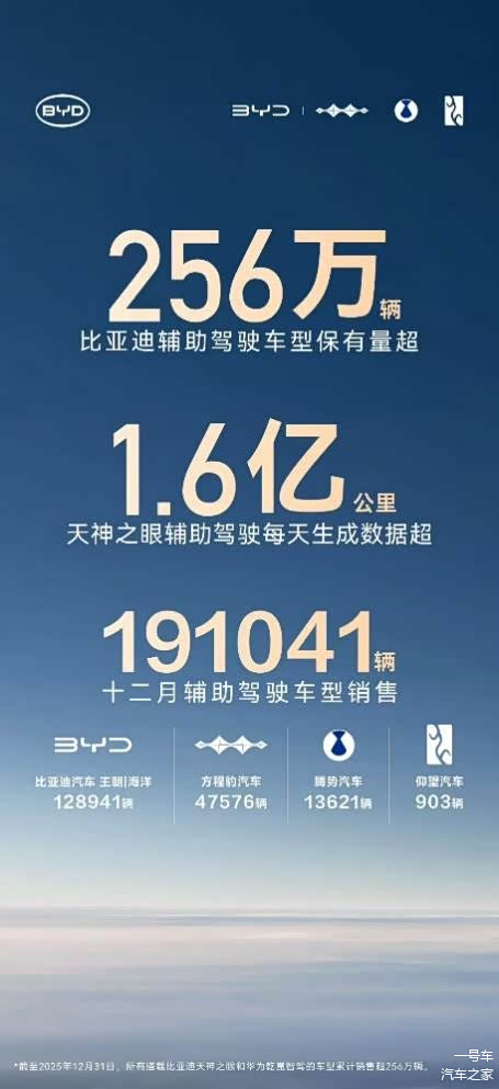 当辅助驾驶从汽车行业的 “加分项” 变成用户购车的 “必选项”,比亚迪用实力给出了最优解。截至 2025 年 12 月,比亚迪辅助驾驶车型累计保有量超 256 万辆,稳居中国车企第一,让 “全民智驾” 的承诺照进现实,让技术普惠走入千家万户。
