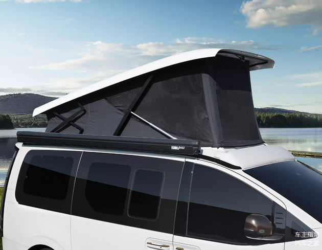 首先来看车顶,为了进一步拓展车辆的实用空间,官方将车顶改成了“电动弹出式”设计,提供可伸缩顶棚,在升起的情况下相当于在车顶支起来一顶帐篷,形成一个相对密闭的内部空间。同时还配备有车顶侧伸缩天幕,省去了露营爱好者后期加装的步骤。